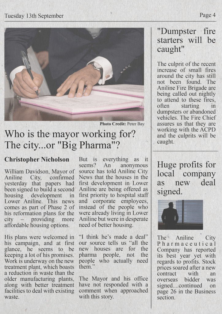 Newspaper Article: Who is the Mayor working for? The city…or “Big Pharma”? Type: Aniline City Lore Click on the image to view this as a PDF file. Related